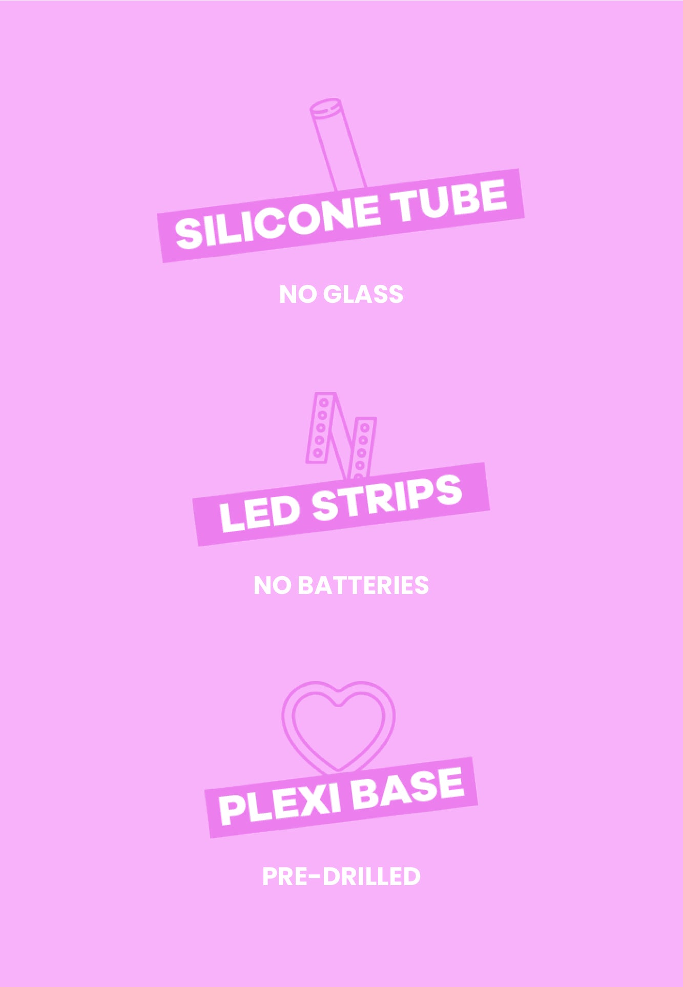 Candyshock are light signs made in a special silicone LED tube and a shaped plexiglass panel as a support. Unlike neon lights, they are not made of glass, they don’t contain gas or mercury, they don’t produce heat, don’t emit nor contain harmful substances and are maintenance free.